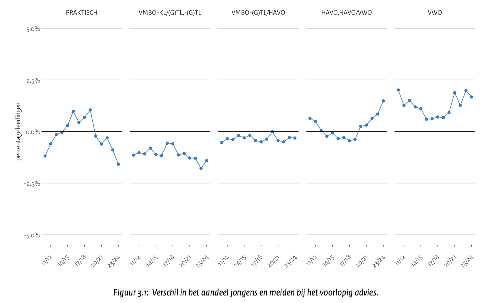 DUO (Dienst Uitvoering Onderwijs) kwam onlangs met het rapport “Verschil in schooladvies tussen jongens en meiden’ met als ondertitel: Meiden op afstand”. De titel belooft vuurwerk, maar het grootste verschil dat gevonden werd? 1,4 procentpunt. Dat is zo weinig dat de grafiek uit elkaar werd getrokken om het überhaupt zichtbaar te maken.