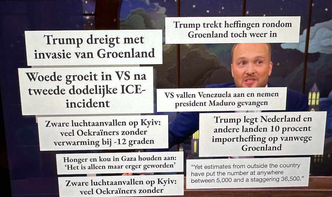 Arjen Lubach had op maandag 2 februari weer zijn eerste show na de winterstop. Hij was erg geschrokken van de maand januari en de snelle opeenvolging van gebeurtenissen. Dat leverde dit plaatje op: