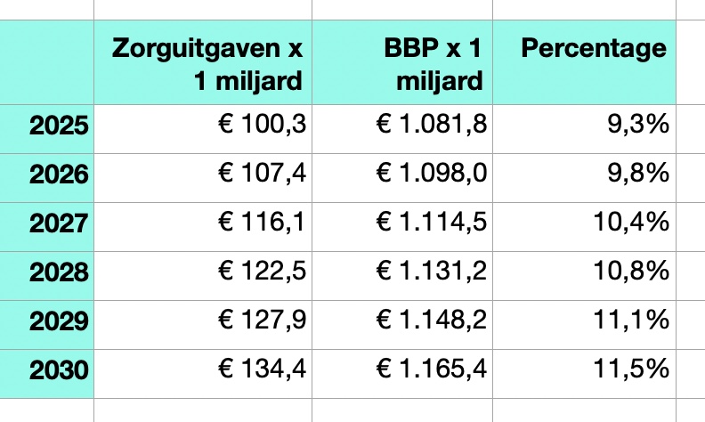 In dit overzicht stijgt het percentage voor zorg in procenten van het BBP (datgene wat we met z’n allen produceren/verdienen) van 9,3% naar 11,5%. Dat is zeer ver verwijderd van de doembeelden van een kwart van wat we met elkaar gaat naar zorg. Is 11,5% van wat we met elkaar produceren/verdienen teveel voor zorg? Het onderwerp dat heel veel kiezers het belangrijkste vinden? Laten we elkaar niet gek maken met verhalen dat de zorg onbetaalbaar wordt. Ja, de kosten stijgen, maar kijk ook altijd naar het BBP om te beoordelen of het wel of niet maatschappelijk te dragen is.